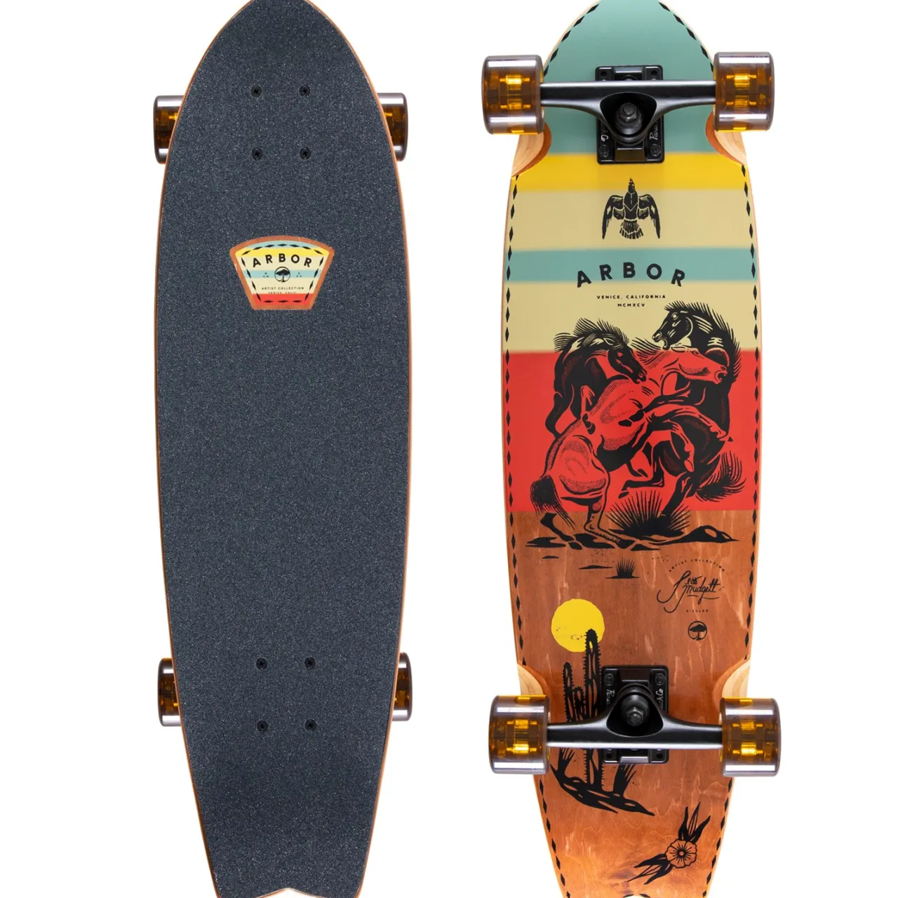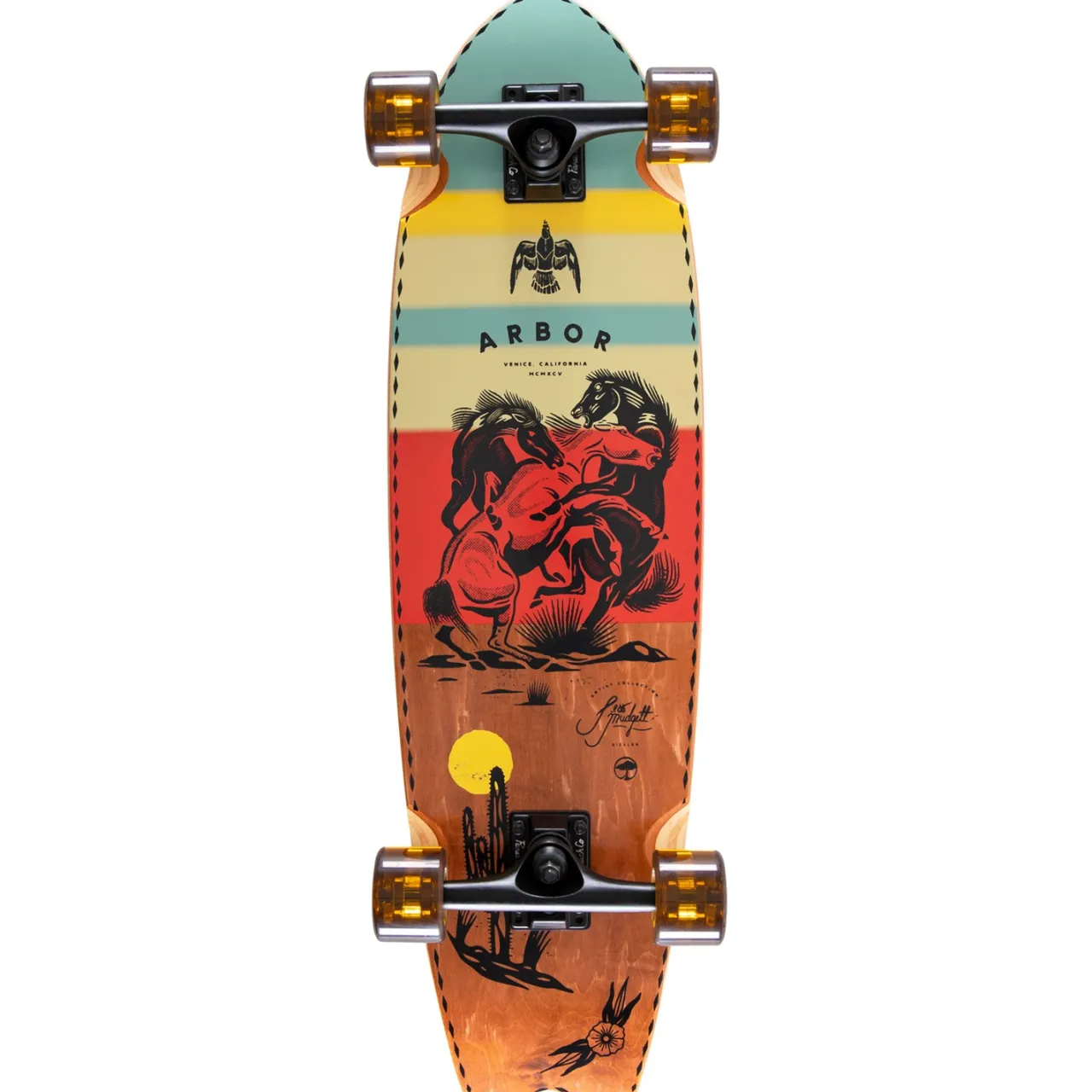 Ride waves of style and skill with the Arbor Sizzler Artist Jess Mudgett Cruiser Complete. Crafted from 7 Ply Sustainable Canadian Maple, this bad boy’s perfect for unleashing your inner artist while you carve. Featuring Paris Street 149mm trucks and Arbor Shakedown Series wheels with a grip that’ll make you feel like you’re really locked in, it’s all about control and confidence without sacrificing those sweet, sweet thrills. ABEC 7 bearings and spacers plus 1/8″ hard risers keep the ride smooth, while the die-cut griptape ensures your feet stay locked in for the smile inducing rides.