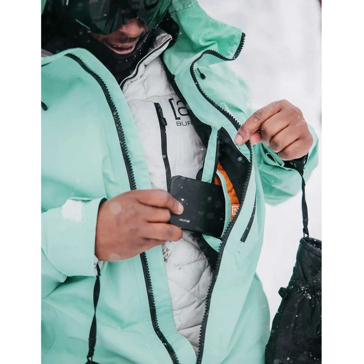 Ergonomic Water-Repellent Zip-Out Stretch Waist Gaiter with Jacket to Pant Interface–        Engineered for the movements of snowboarding, this ergonomic waist gaiter seals out snow and cold like never before, and is removable for customizing performance. The longer back creates an ergonomic fit, articulating with your body for an interface that stays locked in all day long.