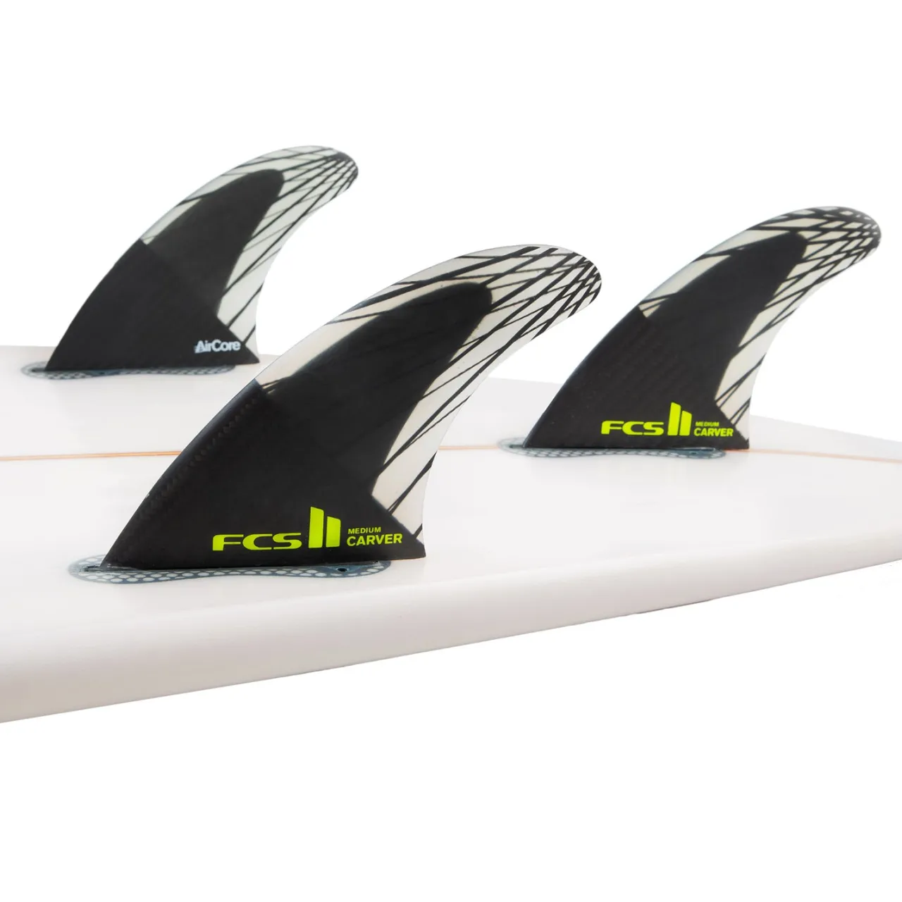 AirCore–        Fins with AirCore Technology feature a pressed polyurethane foam core that mimics the geometric foil of the fin. AirCore technology reduces the amount of fiberglass required in the RTM moulding process making it much lighter while allowing total manipulation of the flex.