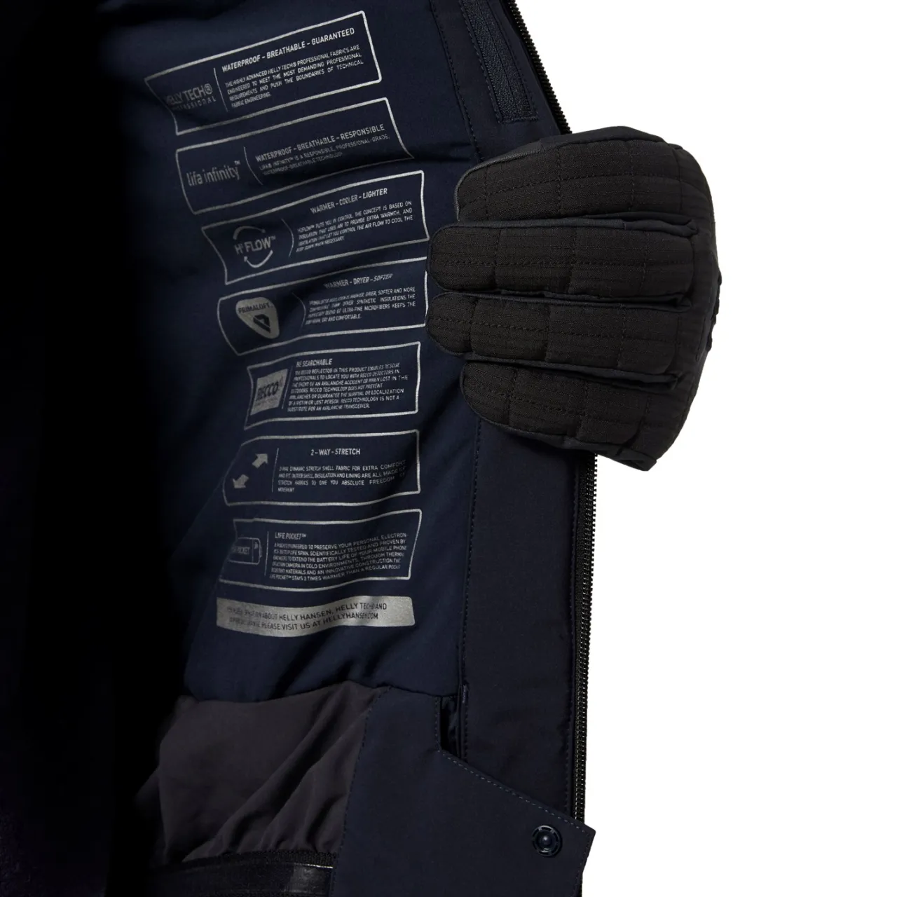 Primaloft® Aerogel Pocket–        Helly Hansen’s insulating pocket that protects the battery of cell phones even in the most extreme weather conditions (-28.0 °C / -18.4 ℉). This high performance insulation composite is a pressure resistant material encapsulated in a waterproof membrane that can be used for insulating pockets, shoes, and gloves.