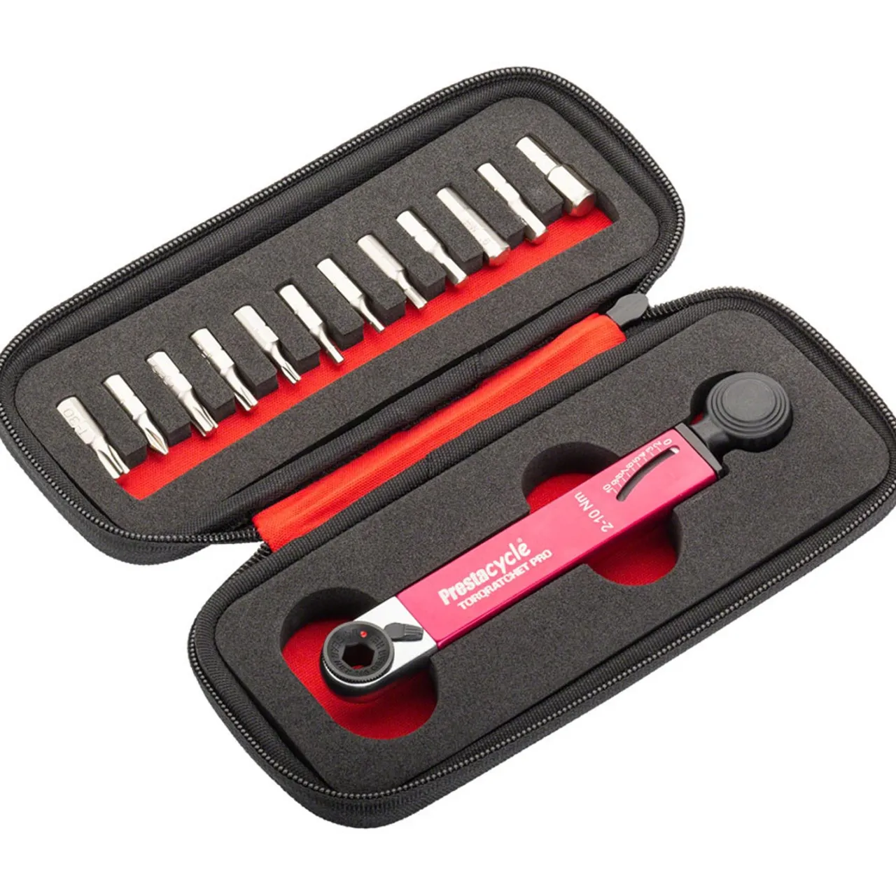 At-home mechanics will love the Prestacycle TorqRatchet PRO Deluxe Pocket Multi-Tool Set. This go-everywhere tool kit includes 12 unique bits specific for bicycles, including a hex set, torx, and classic screwdriver. The included Neoprene case makes the PRO a staple in any travel tool kit. The zipper closure prevents loss of tools or parts, and every bit has a place.
