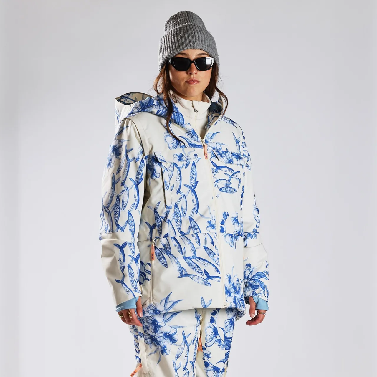 The Spyder Society Field Jacket is your chameleon of outerwear – seamlessly transitioning from full jacket to vest with 80g of strategic EXO THERMO insulation. Waterproofed with a 10k laminate and DWR coating, this piece comes dressed in a whimsical print that’s part watercolor dreamscape, part Scandinavian storybook – complete with forget-me-nots, a swimming school of Swedish fish, and hidden forest children. Pro tip: pair it with the Terrain bibs for the ultimate cozy kit.