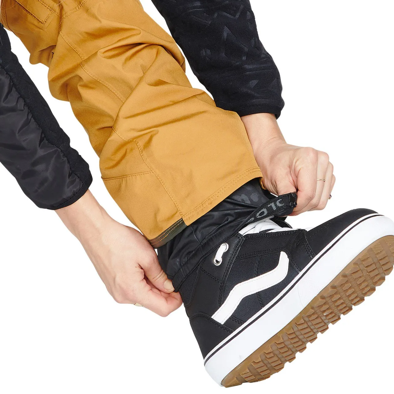 Boot Gaiter with Lace Hook–        A gaiter sleeve attached to the inner cuff of the pant that fits snugly over and around the top of your boot and hooks to your laces to help keep it in place.