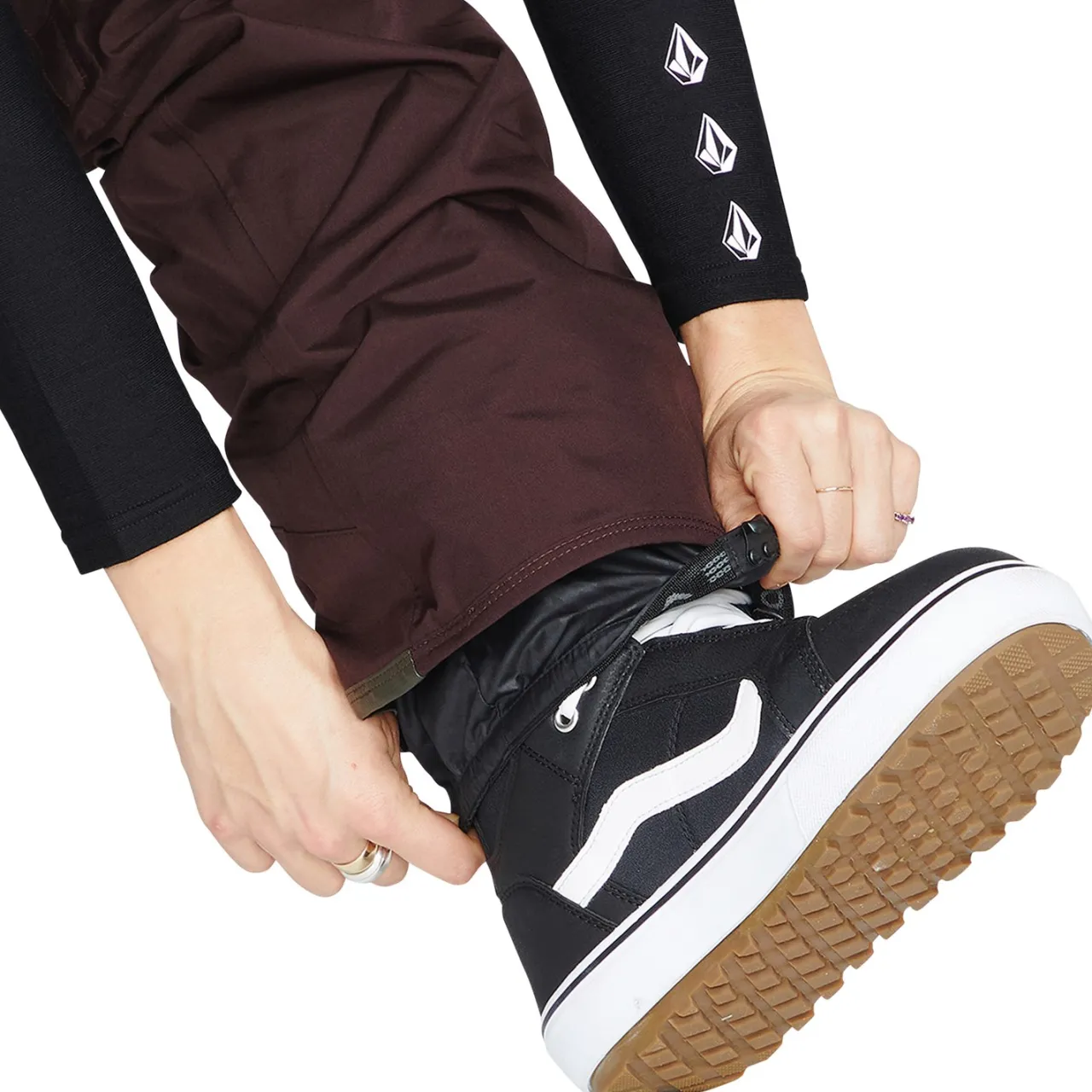 Boot Gaiter with Lace Hook–        A gaiter sleeve attached to the inner cuff of the pant that fits snugly over and around the top of your boot and hooks to your laces to help keep it in place.