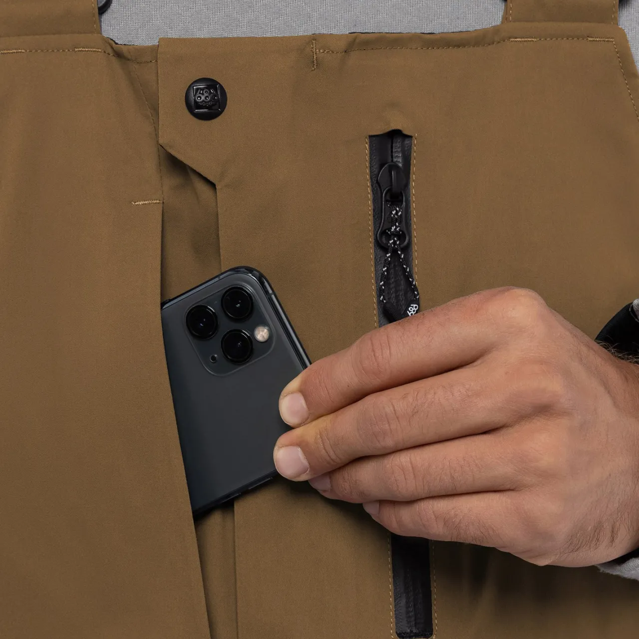 Water-Resistant Front Hand Pockets and Upper Bib Pocket Zippers