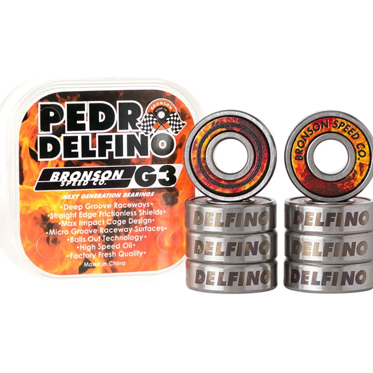 The Bronson G3 Pedro Delfino Pro Bearings come blazing with racing flames and laser-etched detailing that perfectly matches Pedro’s full-throttle style. These precision bearings keep you rolling hot through every session – because sometimes you need your wheels to be as fired up as your skating.