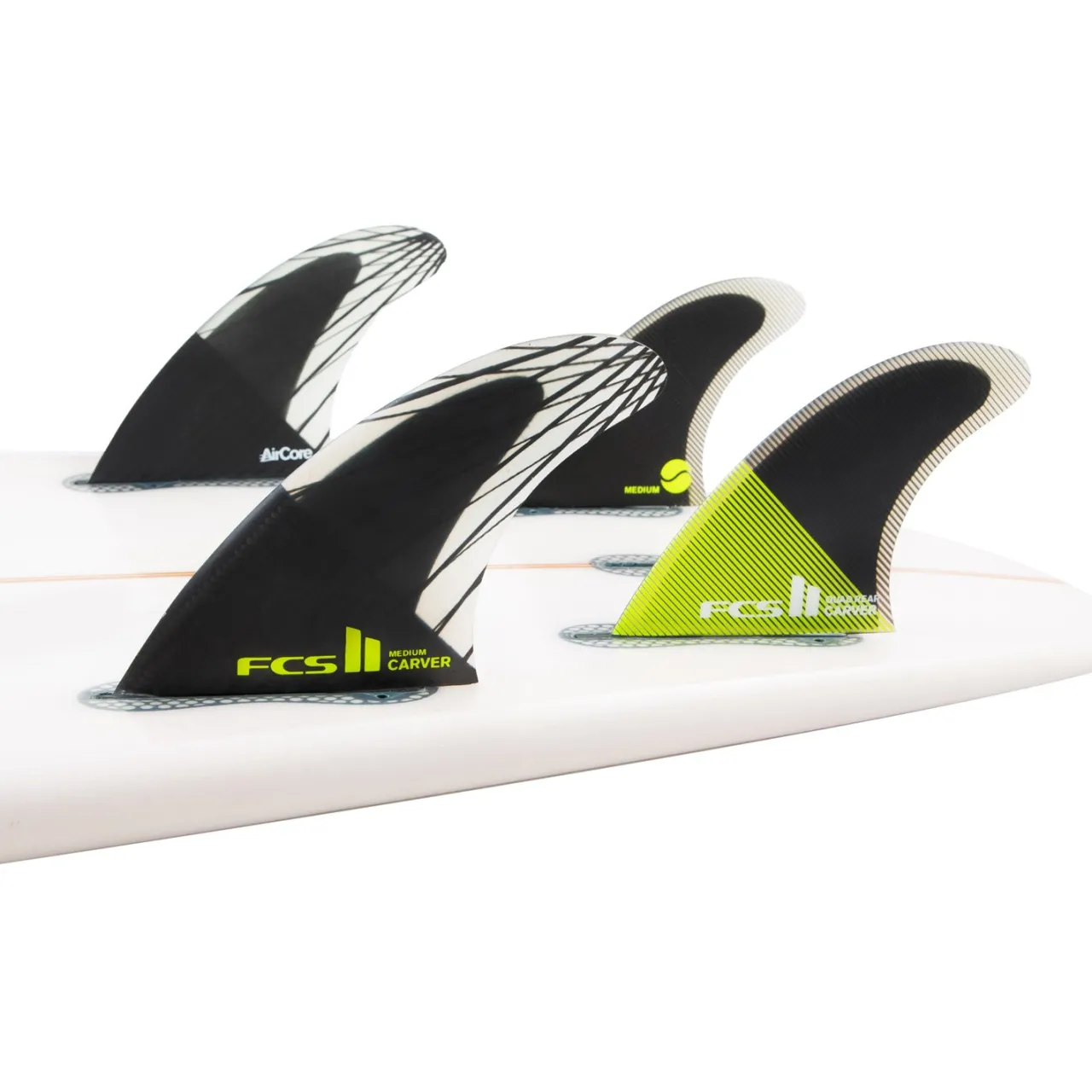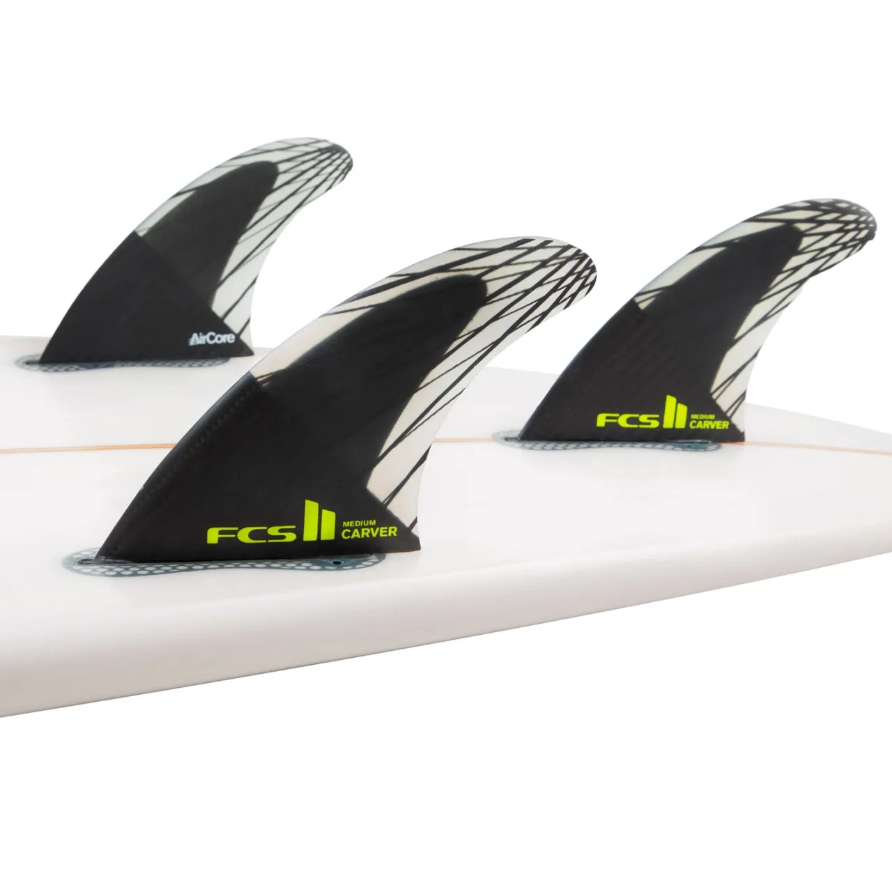 AirCore–        Fins with AirCore Technology feature a pressed polyurethane foam core that mimics the geometric foil of the fin. AirCore technology reduces the amount of fiberglass required in the RTM moulding process making it much lighter while allowing total manipulation of the flex.
