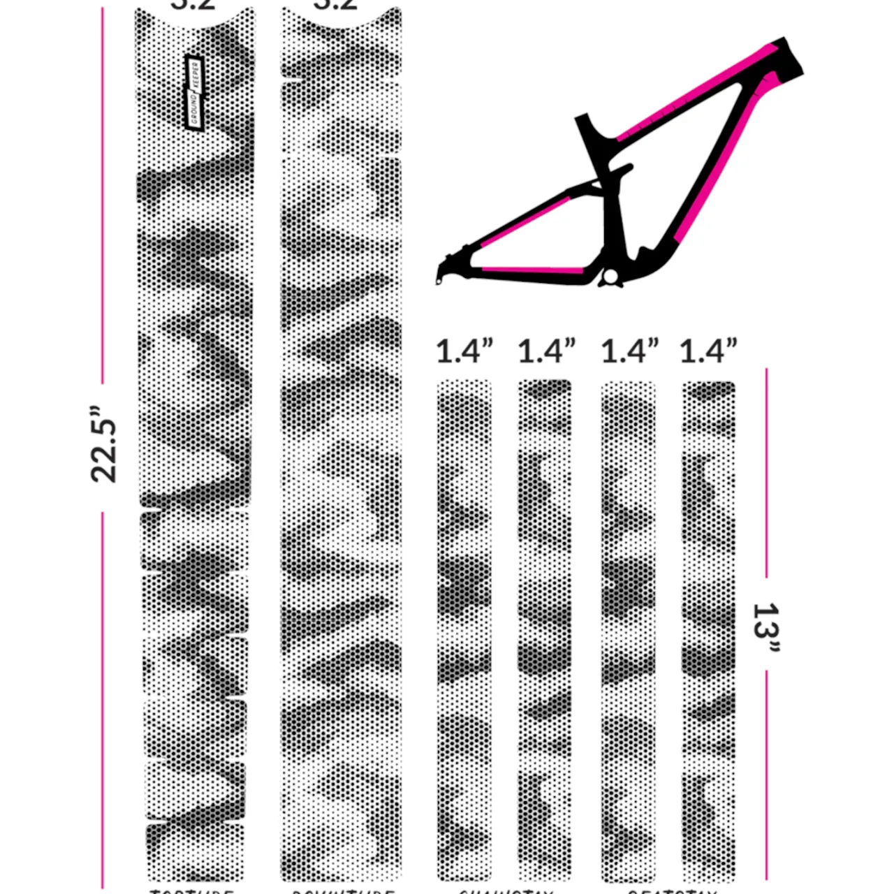 Universal Fit–        Comes with 6 easy-to-trim pieces for top tube, downtube, chainstays, and seatstays.