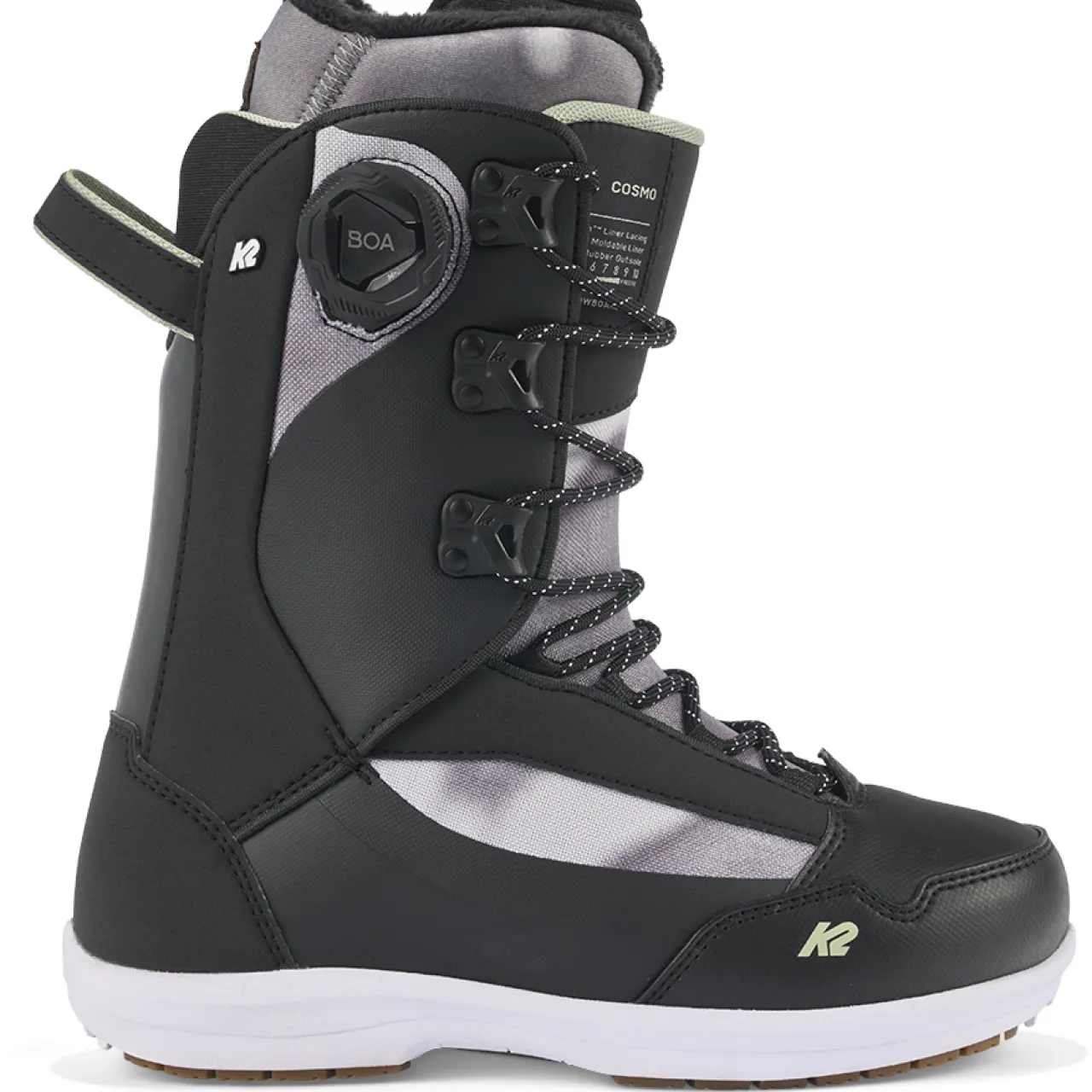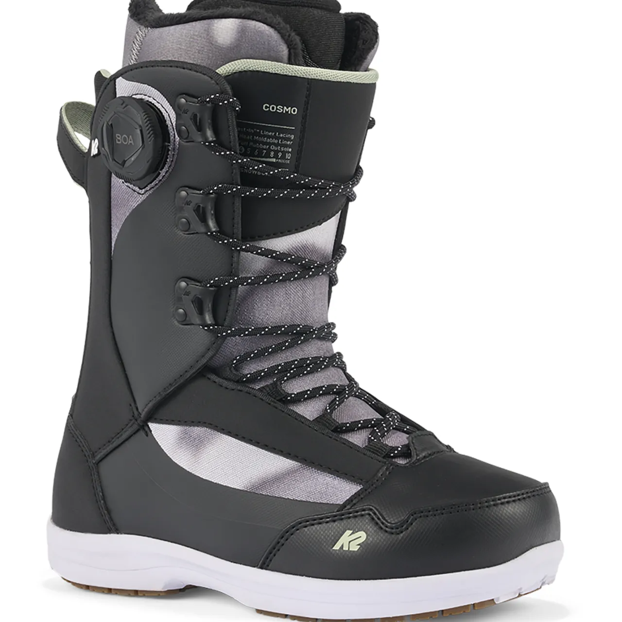 The K2 Cosmo Snowboard Boots are ideal for the all mountain freestyle rider moving and shaking from peak to park. Their combination of traditional lace-up exterior and a locked-down BOA Intuition liner provides the best of both worlds, allowing you to fine tune your fit to perfection every time. A soft, tweakable flex ensures maximum mobility in the park, but won’t let you down when you need to traverse that choppy mogul field to make it to your favorite side hits. An awesome boot for riders of any ability level.