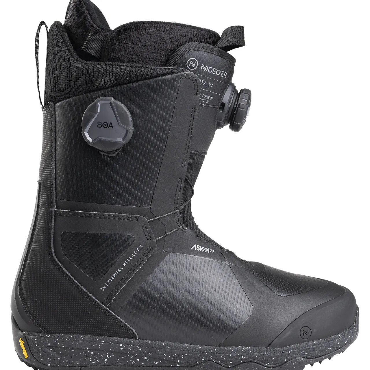 Asym 3F–        Part of the ASYM3F Technology : FIT – FEEL – FLEX are combined in an asymmetric shape and closure system that delivers optimum support and flex. Lined up along the asymmetrical molded tongue, the Boa® Fit System lace guides are also asymmetrically positioned on the flatter areas of your forefoot for less point-loaded pressure and a more even closure, which increases medial arch support to reduce foot fatigue and cramping. This Nidecker innovation is codeveloped with and approved by Boa®.