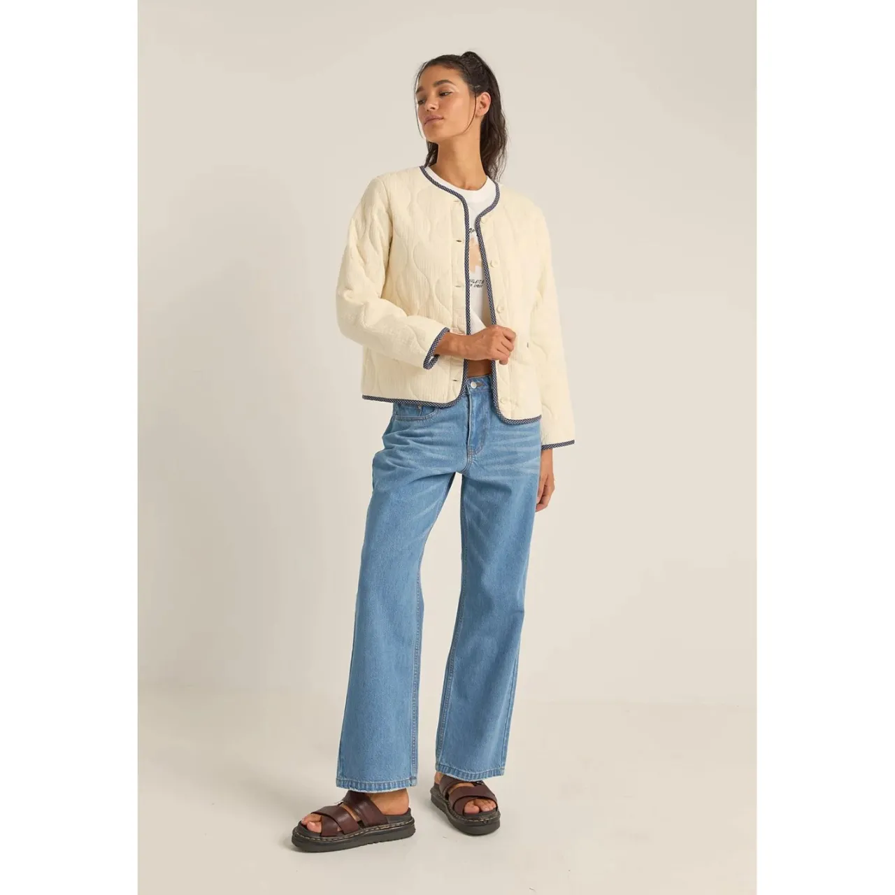 The Rhythm Check Quilted Jacket wraps you in the kind of cozy that makes morning beach walks and evening patio hangs equally inviting. This wide-cut wonder plays with classic quilting and modern details – from its thoughtful V-neck to those clever dual closures – while contrast binding adds just the right amount of sophistication to its laid-back coastal soul.