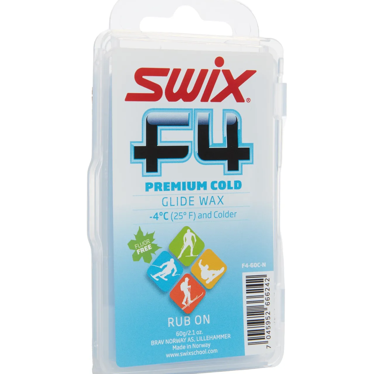 SWIX F4-60C-N Glidewax Cold 60g w/cork is a rub-on wax for temperatures under 4˚C (25˚F). Simply rub it on and polish with the cork supplied on the package.
