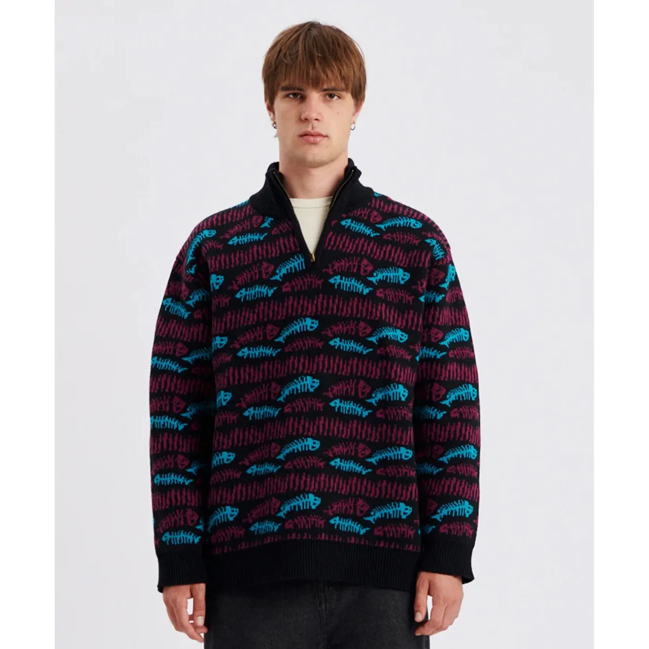 Chilly days call for The Critical Slide Society Boneyard 1/4 Zip Knit. Knit with soft cotton acrylic fabric and a slightly oversized crewneck fit, it keeps you warm and good-looking when you need it most.