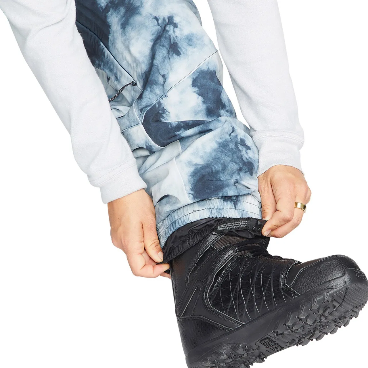 Boot Gaiter with Lace Hook–        A gaiter sleeve attached to the inner cuff of the pant that fits snugly over and around the top of your boot and hooks to your laces to help keep it in place.