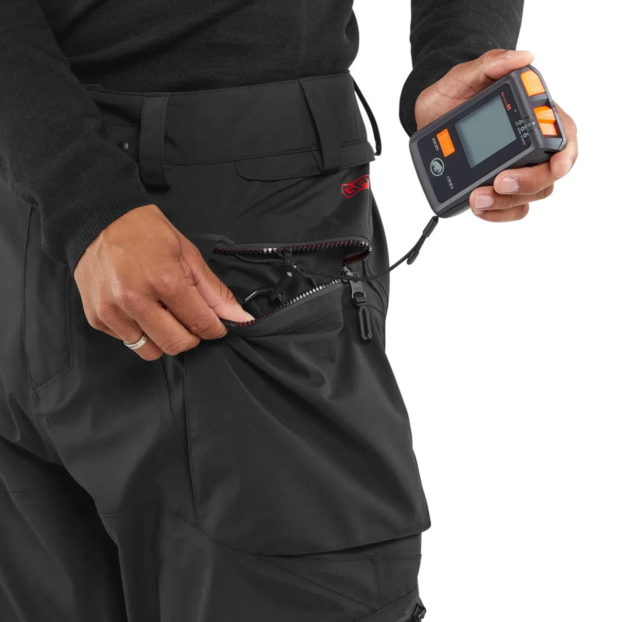 Boot Gaiter with Lace Hook–        A gaiter sleeve attached to the inner cuff of the pant that fits snugly over and around the top of your boot and hooks to your laces to help keep it in place.