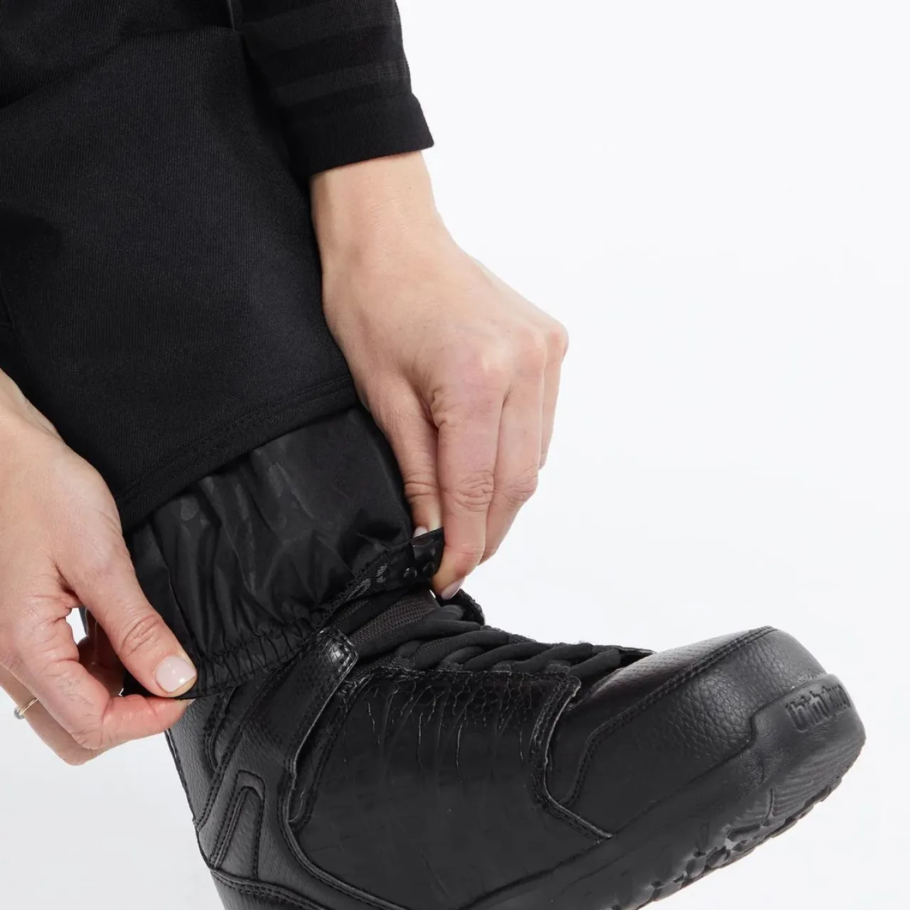 Boot Gaiter with Lace Hook–        A gaiter sleeve attached to the inner cuff of the pant that fits snugly over and around the top of your boot and hooks to your laces to help keep it in place.